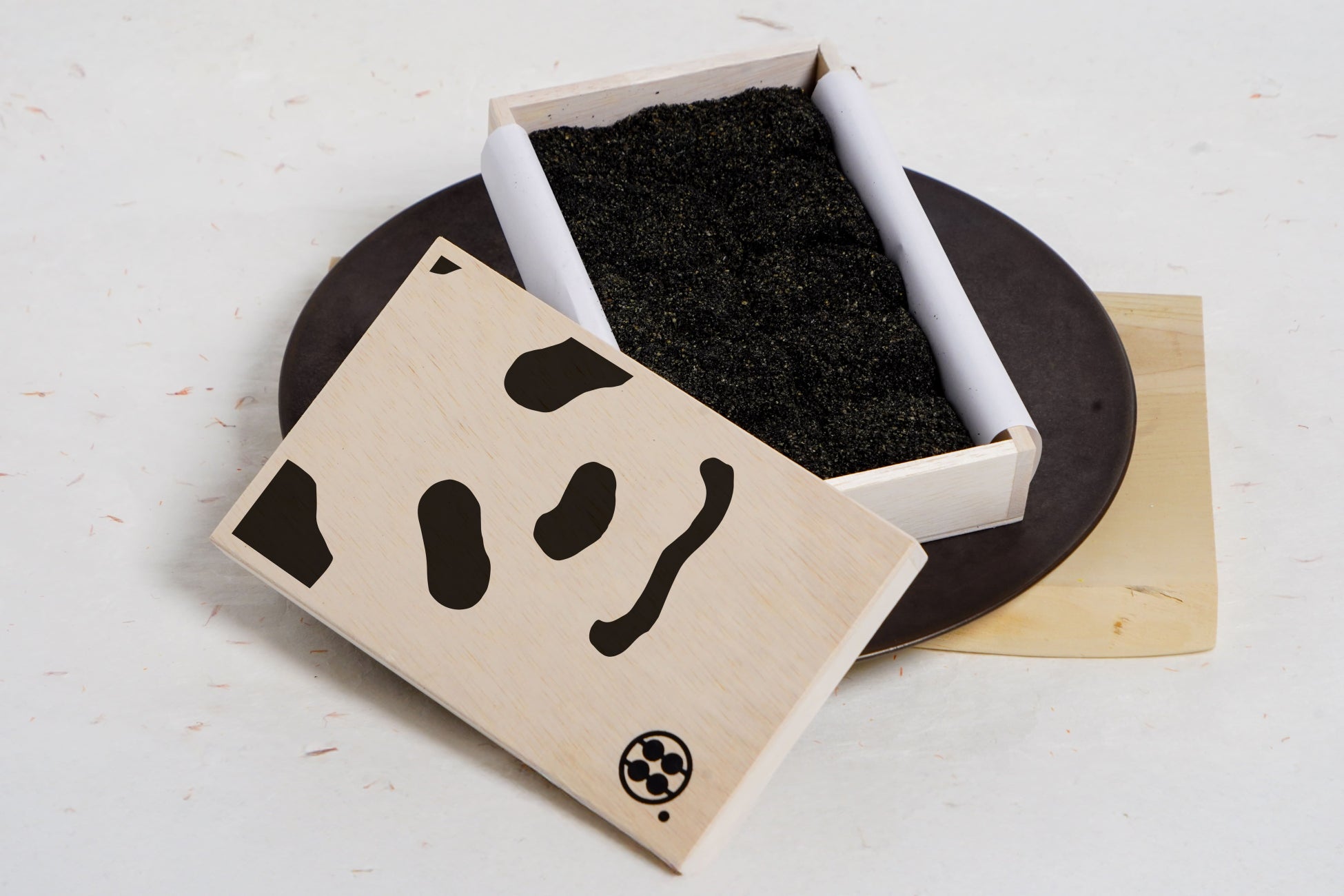 風味豊かな有機黒すりごまをまぶしたわらびもちをパンダ桐箱にお包みします。
