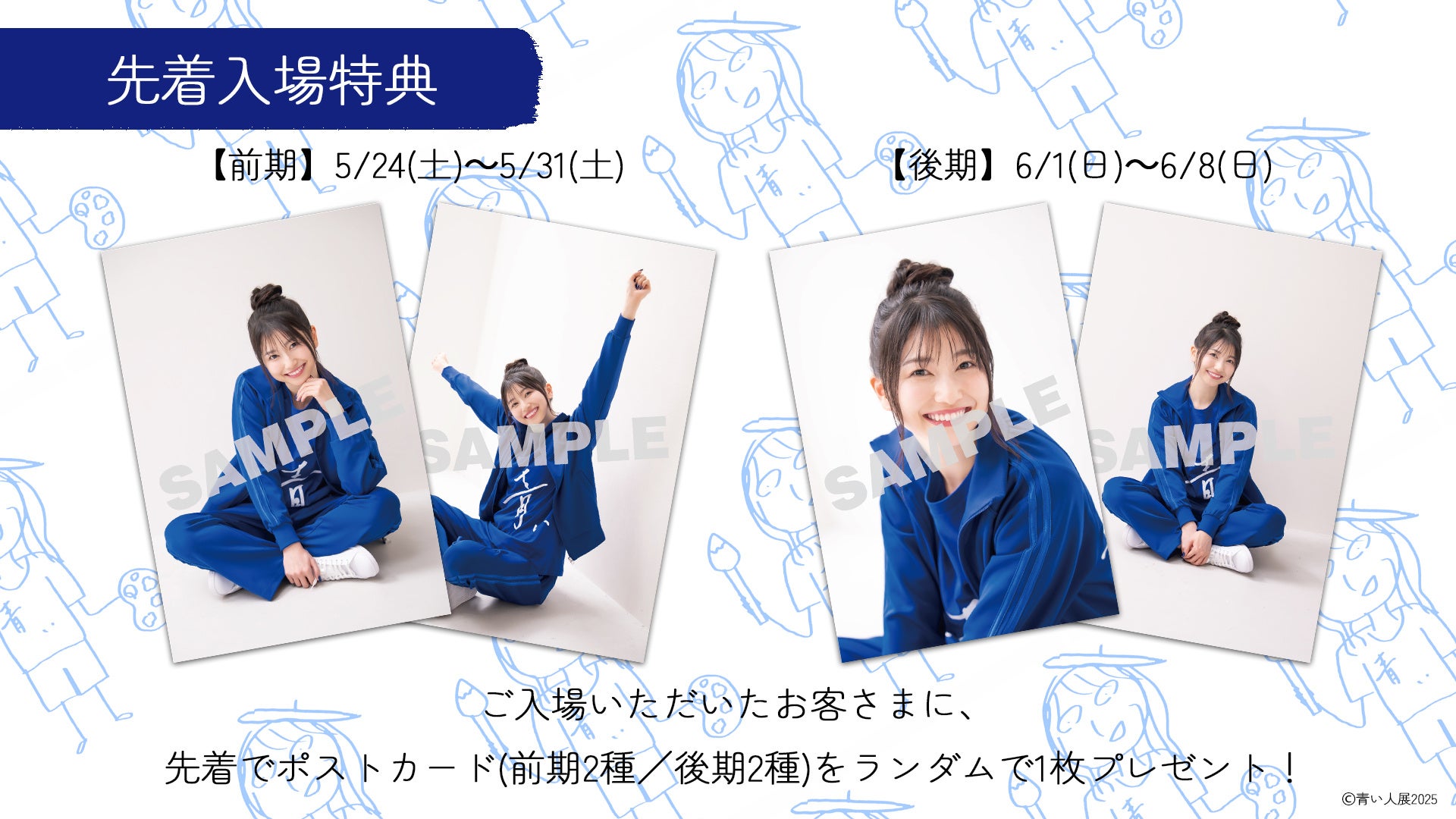 また、先着入場特典として、撮りおろし写真を使用したポストカード(前期2種/後期2種)をランダムで1枚お渡しいたします。さらに、会場では本展覧会の開催を記念した商品の販売も予定しており、開催記念商品のお買い上げ5,000円(税込)ごとに「青い人」ステッカー(全5種)をランダムでプレゼントいたします。