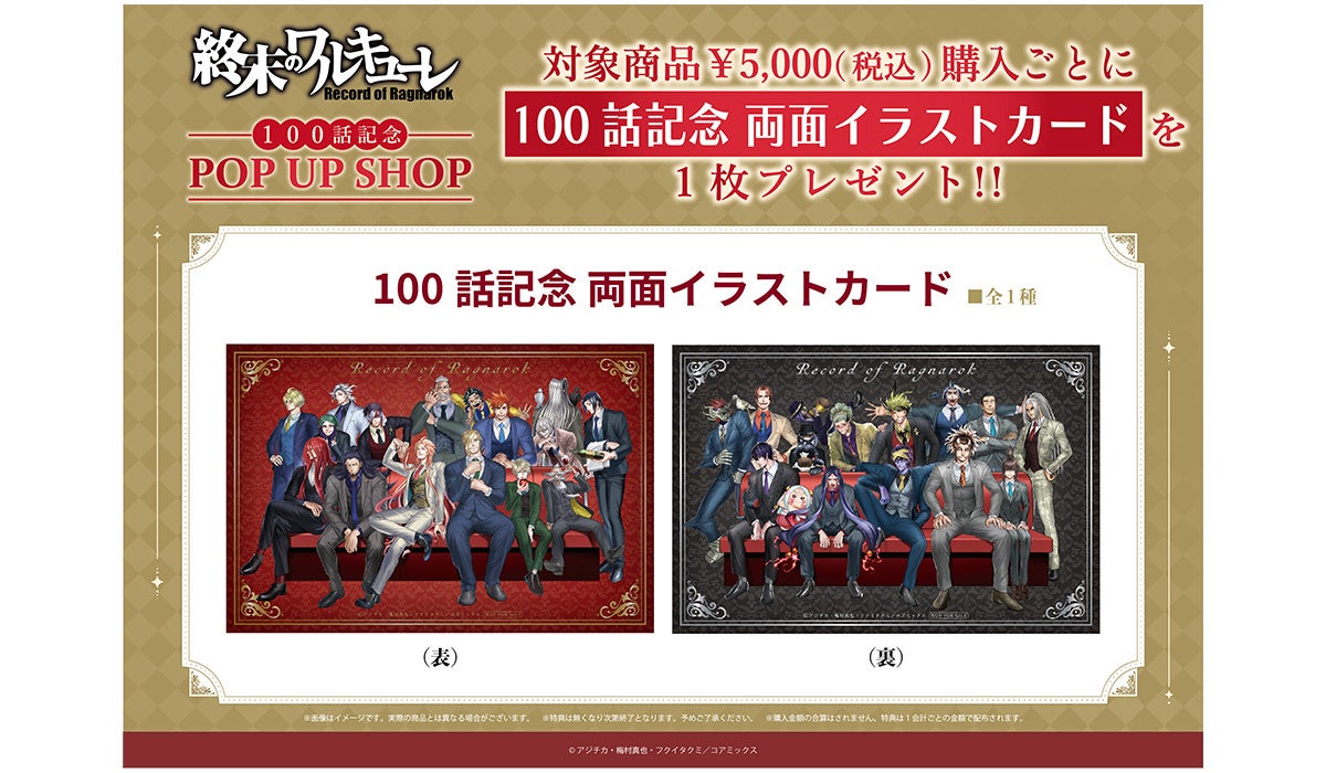 また、2,000円(税込)購入ごとに、先着で購入特典ポストカードをランダムで1枚プレゼントいたします。さらに、追加購入者特典で5,000円(税込)購入ごとに、先着で100話記念 両面イラストカードを1枚プレゼントいたします。
