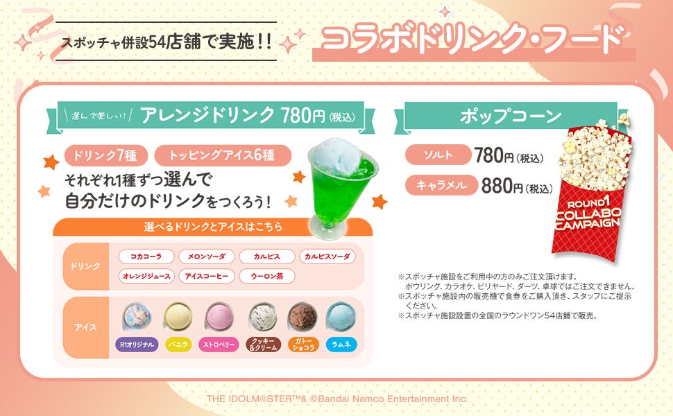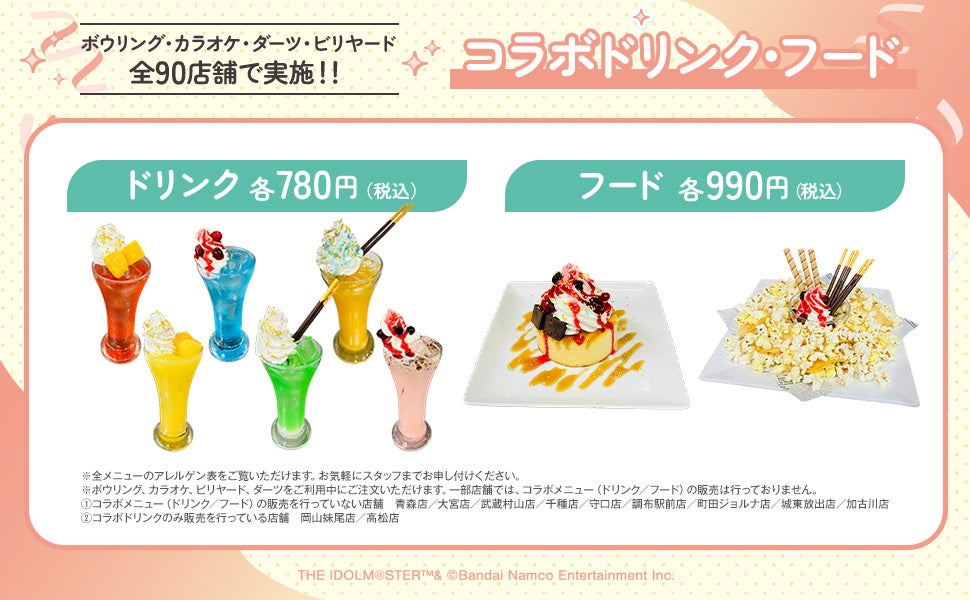 全国のボウリングとカラオケ90店舗でコラボメニューを、スポッチャ併設店舗ではコラボポップコーンを販売いたします。各店舗で販売する対象メニューをご注文いただいたお客様には、コラボメニュー限定ノベルティをプレゼントいたします。