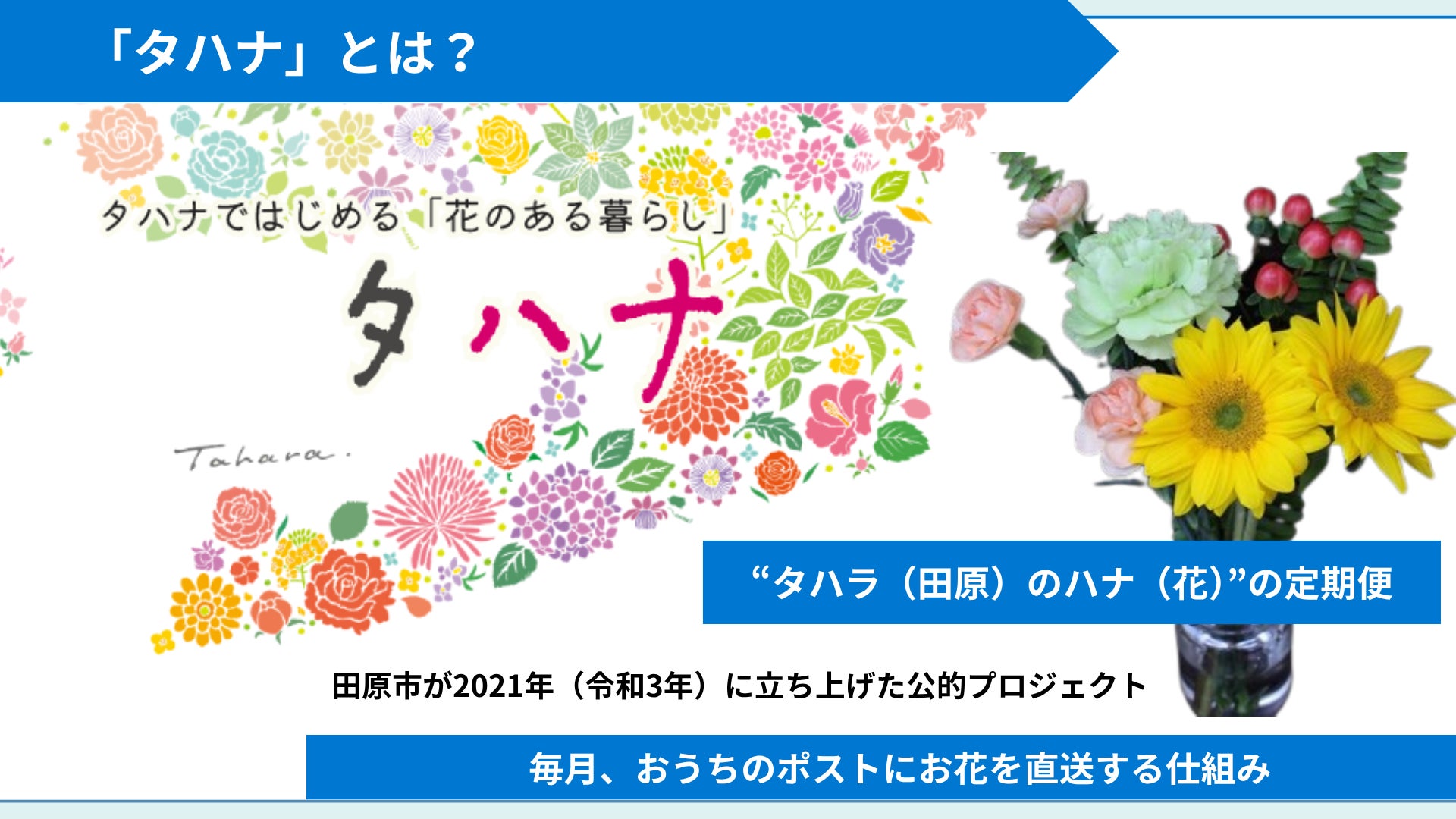 「タハナ」とは、“タハラ(田原)のハナ(花)”の定期便。田原市が2021年(令和3年)に立ち上げた公的プロジェクトで、毎月、おうちのポストにお花を直送する仕組みです。コロナ禍で花の消費が落ち込む中、「もっと日常に花を取り入れてもらいたい」という思いから誕生しました。現在では、障がいのある方が花をラッピング・配送するなど、福祉との連携も行われています。
