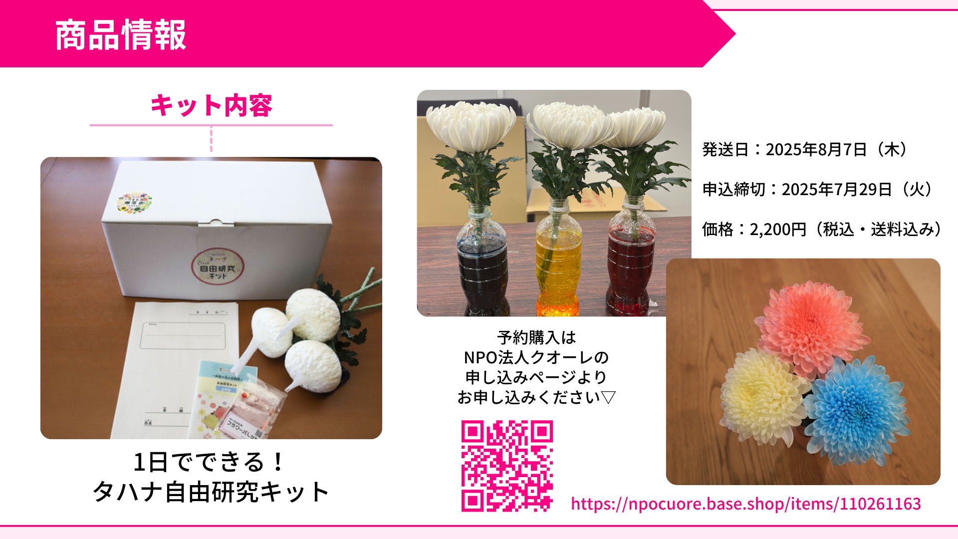 愛知県田原市が運営する「タハナ」事業の認定事業者である、愛知県豊橋市のNPO法人クオーレは、2025年夏、小学生向けに花の染色体験を通じて伝統文化と科学を学べる「自由研究キット」の販売を開始します。菊農家直伝の染め方で輪菊を染める実験を通じて、自然の変化を五感で感じ、自由研究としてまとめることができる体験型キットです。