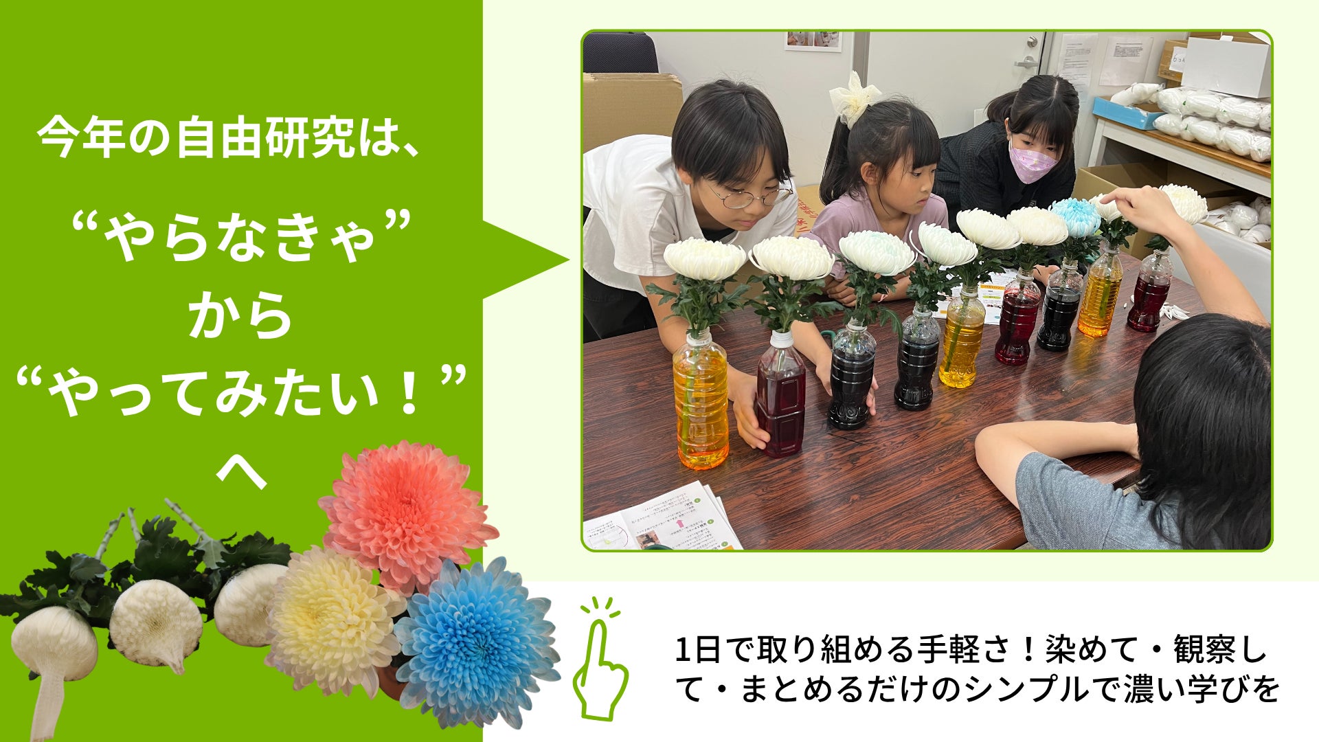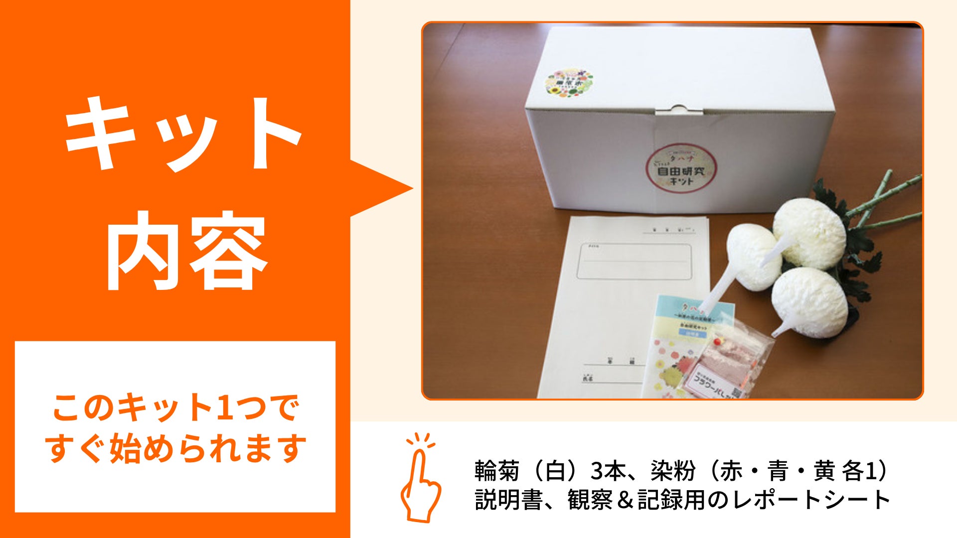 自由研究のテーマ選びに悩む夏。そんな親子に向けて、花とふれあいながら学べる体験型のキット「タハナ自由研究キット」が登場しました。主役は、古くから日本人に親しまれてきた「輪菊」。田原市の菊農家直伝の染め方で、自分の手で1本1本を染めていく過程を観察・記録することで、理科や文化にまたがる学びを深められる内容となっています。