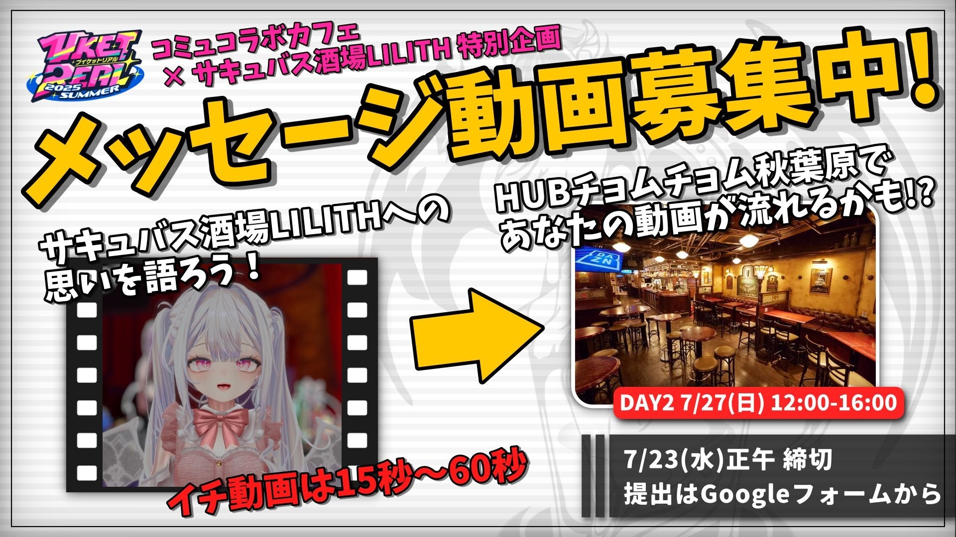 さらに、サキュバス酒場LILITHへの思いを語った動画を店内で配信。動画は7月23日(水)正午まで募集しています。