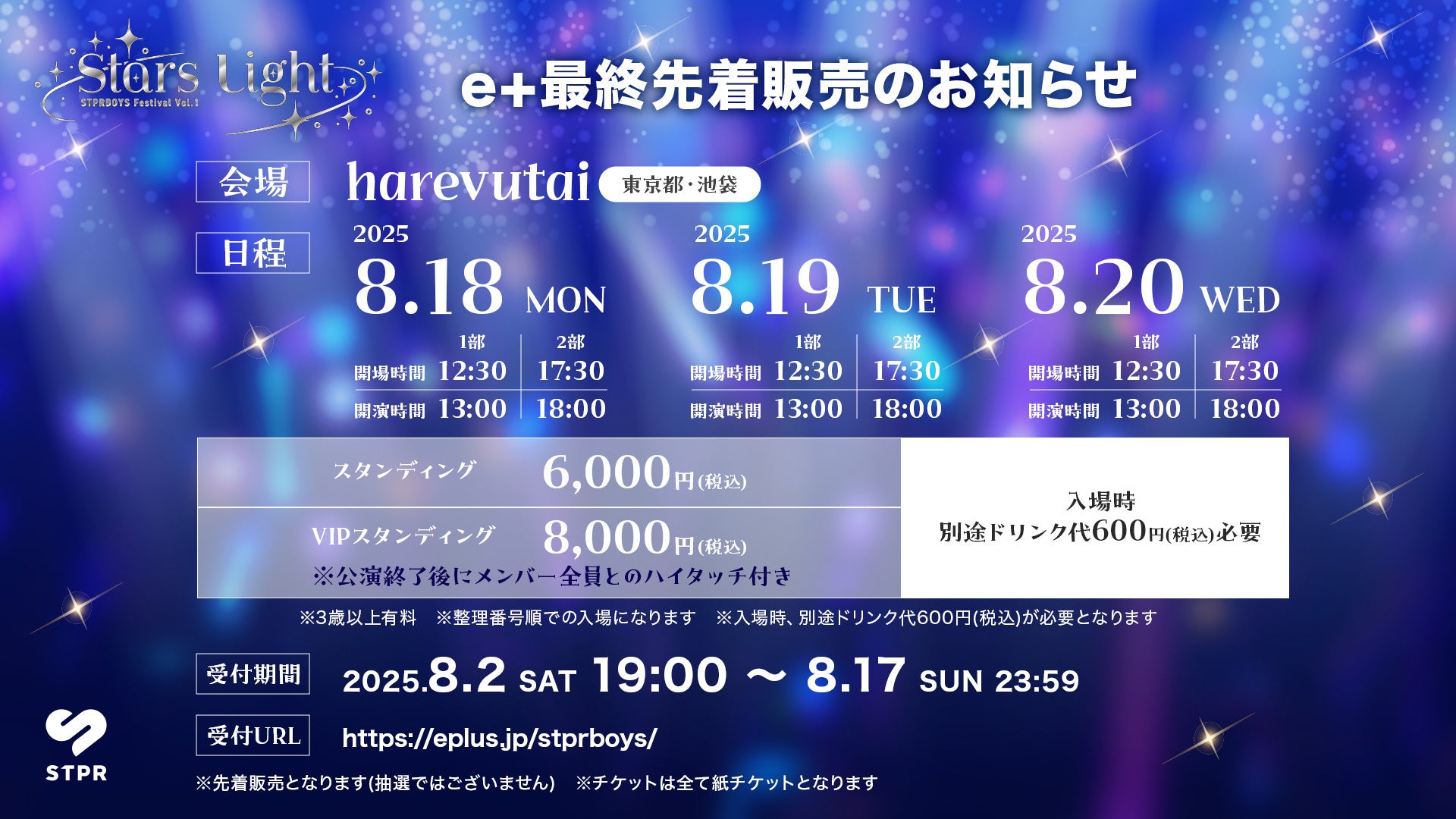 そして今回、2025年8月18日(月)から3日間に渡り開催する『STPR BOYS Festival Vol.1 《STARS LIGHT -スターズライト-》』は、先行販売期間中に多くの反響をいただき、リスナー(ファンの呼称)の皆さまからのご要望にお応えする形で、チケットの【e+最終先着販売】を実施する運びとなりました。ライブにご参加いただけるラストチャンスとなります。