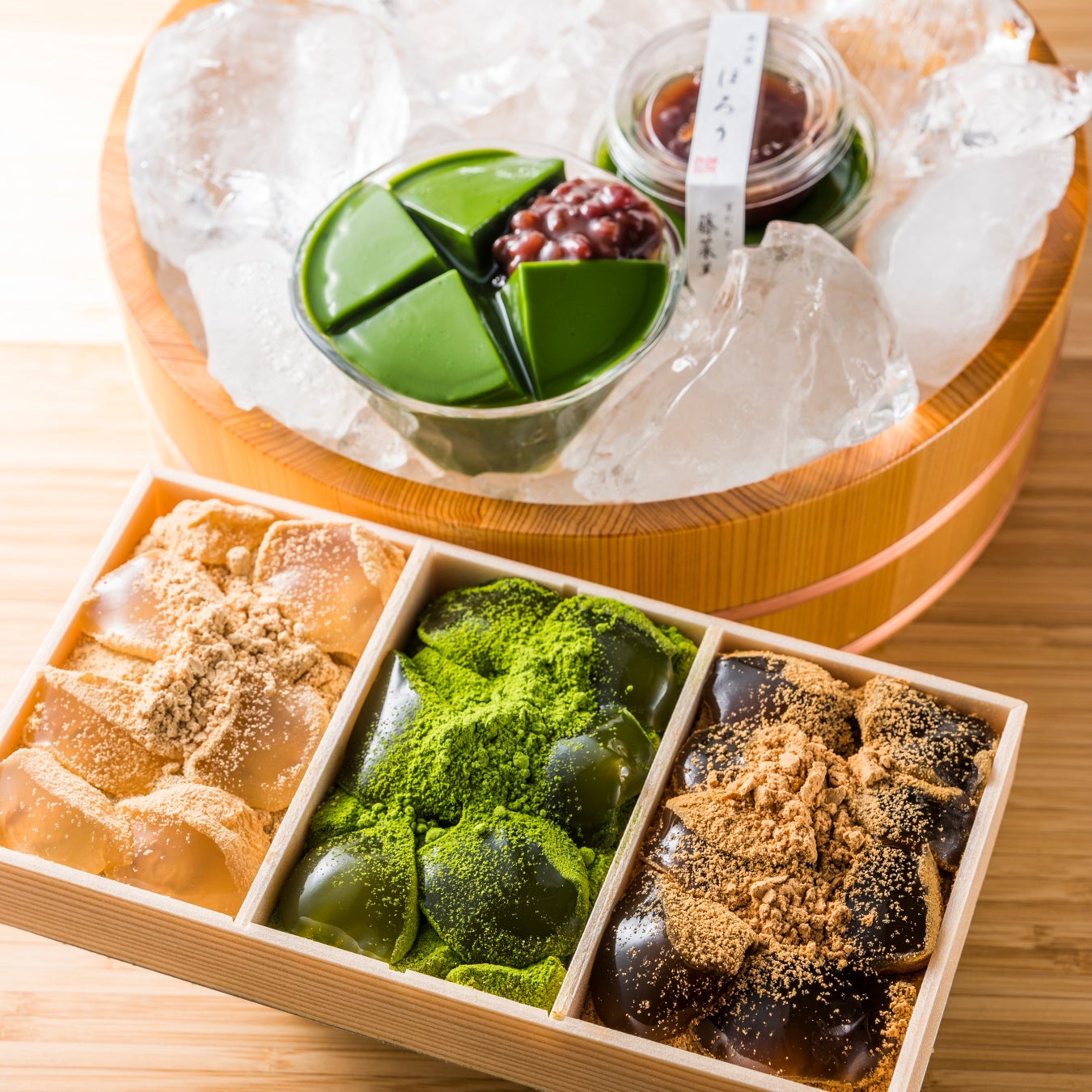 本わらび粉を使用した、なめらかで優しい口溶け国産大豆の皮むききな粉、宇治抹茶、波照間の黒糖3種類それぞれが味わい深い逸品です。