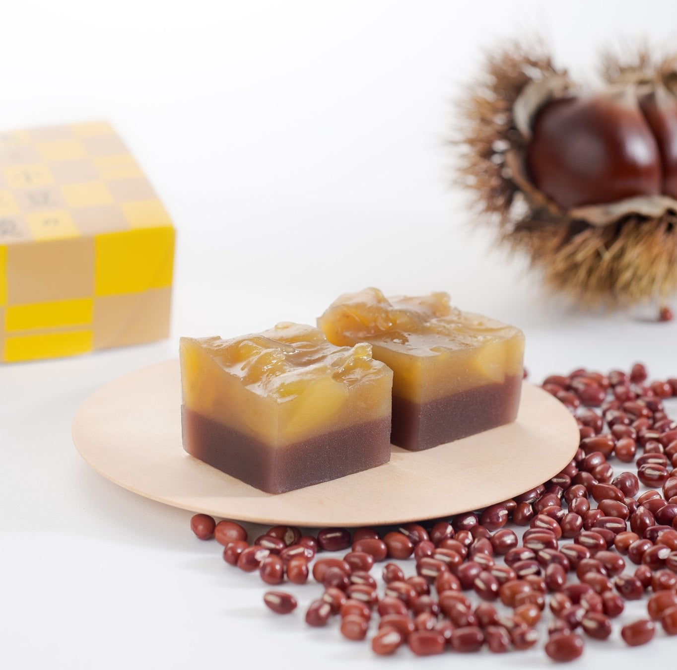 栗の甘露煮を入れた栗羊羹と北海道産小豆のこし餡羊羹を重ねました。