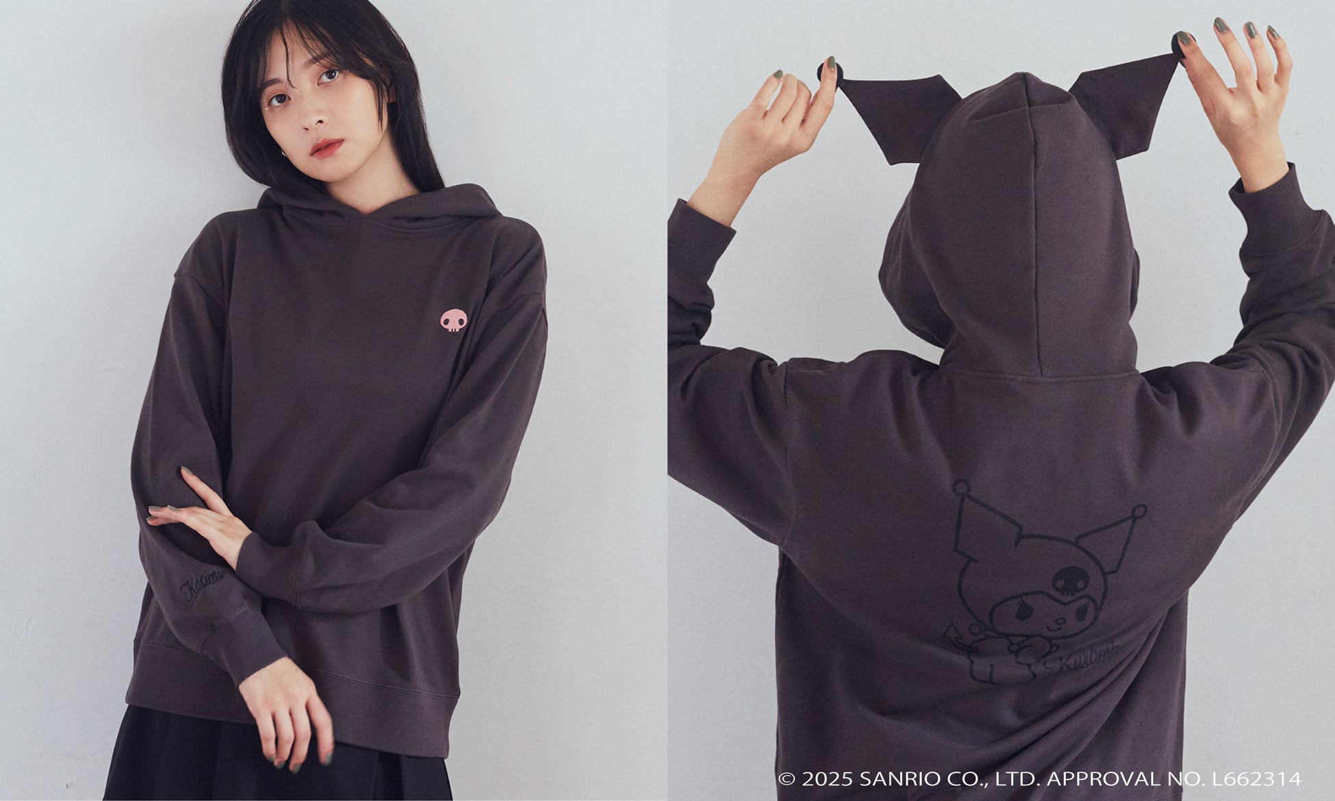 ゆったりとしたシルエットのパーカーは、 フードに各キャラクターの耳モチーフを取り入れ、360度どこから見てもキュートなアイテムに仕上げました。それぞれフロントには音符とドクロをあしらい、バックスタイルには「マイメロディ」、「クロミ」をプリント。キャラクターの魅力をふんだんに詰め込んだ特別な1着をご用意しました。