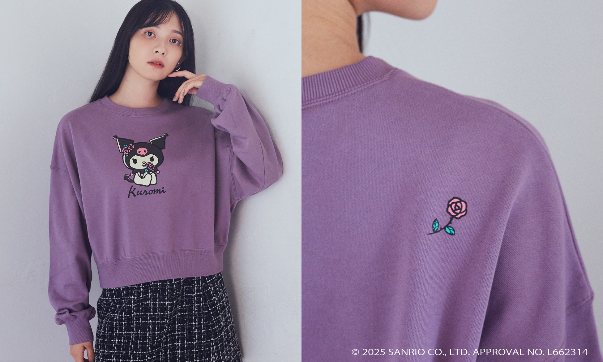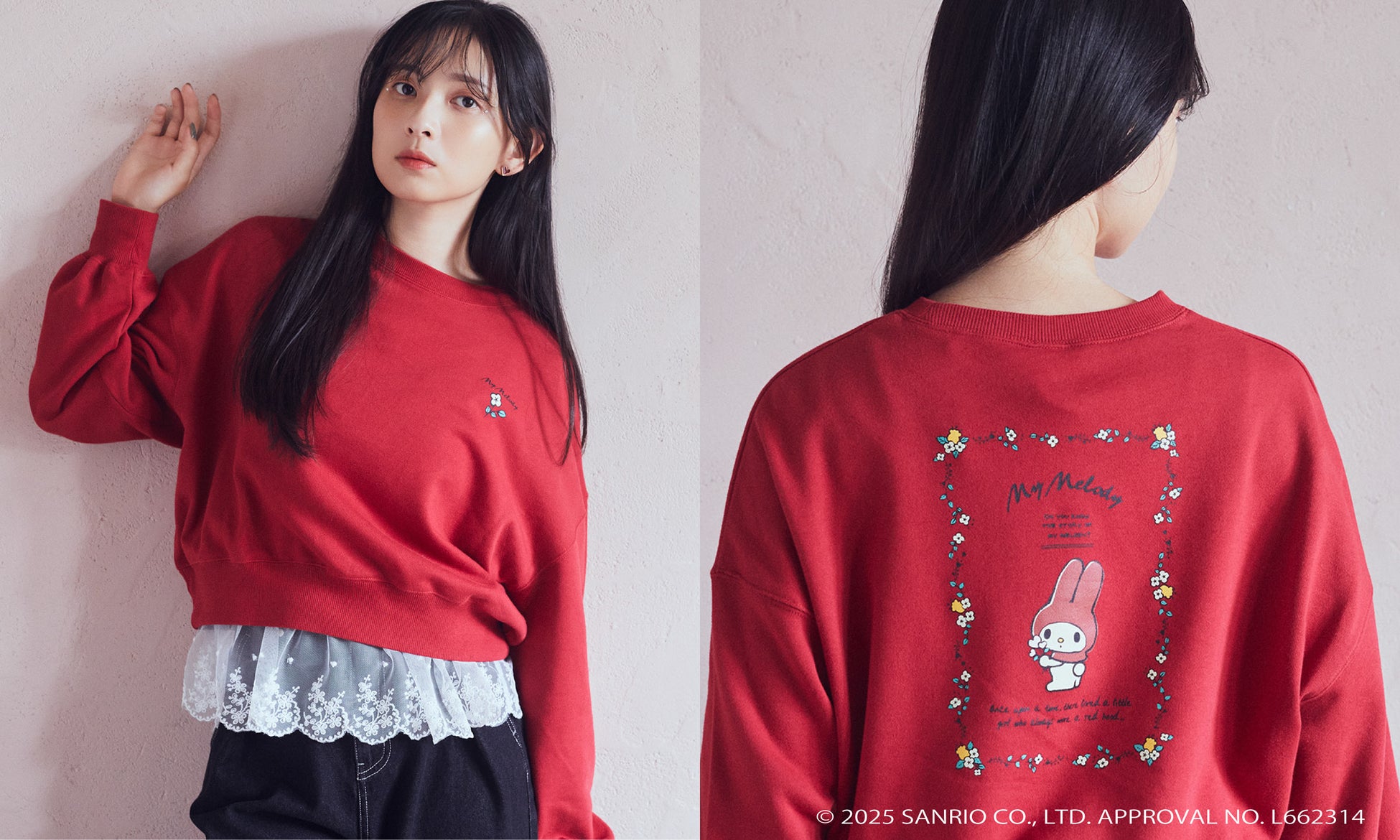 秋を感じる深みのあるレッドとパープルカラーのスウェットには、レトロなアートデザインの「マイメロディ」と「クロミ」をプリントしました。胸元と背面に施したさりげないお花の刺繍もポイントです。