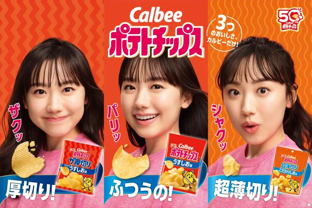 今回のTVCMは、9月に発売50周年を迎えた「ポテトチップス」をはじめ、「ポテトチップス ザ厚切り」、「ポテトチップス 超薄切り」の「うすしお味」の食感の違いを伝えるため、食べ比べに焦点を当てました。芦田さんは、ふつうの、厚切り、超薄切りと3種類の「ポテトチップス」の形状をイメージしたヘアスタイルで、食べる喜びを全力で表現。長年にわたり愛されるロングセラー商品である「ポテトチップス」のおいしさが溢れ出すようなCMに仕上がっています。声と表情の演技“だけ”で3種類の食感の違いを表現する芦田さんの演技力の高さに注目です。