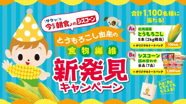 対象商品をお買い上げいただいた方の中から抽選で、A賞として「北海道産とうもろこし 5本 (2kg相当)」と「オリジナルトートバッグ」を100名に、B賞として「シスコーン詰め合わせ 全品 (7品)」と「オリジナルトートバッグ」を1,000名に、それぞれセットでプレゼントします。なお、「オリジナルトートバッグ」は素材の一部に“とうもろこし”を使用しています。