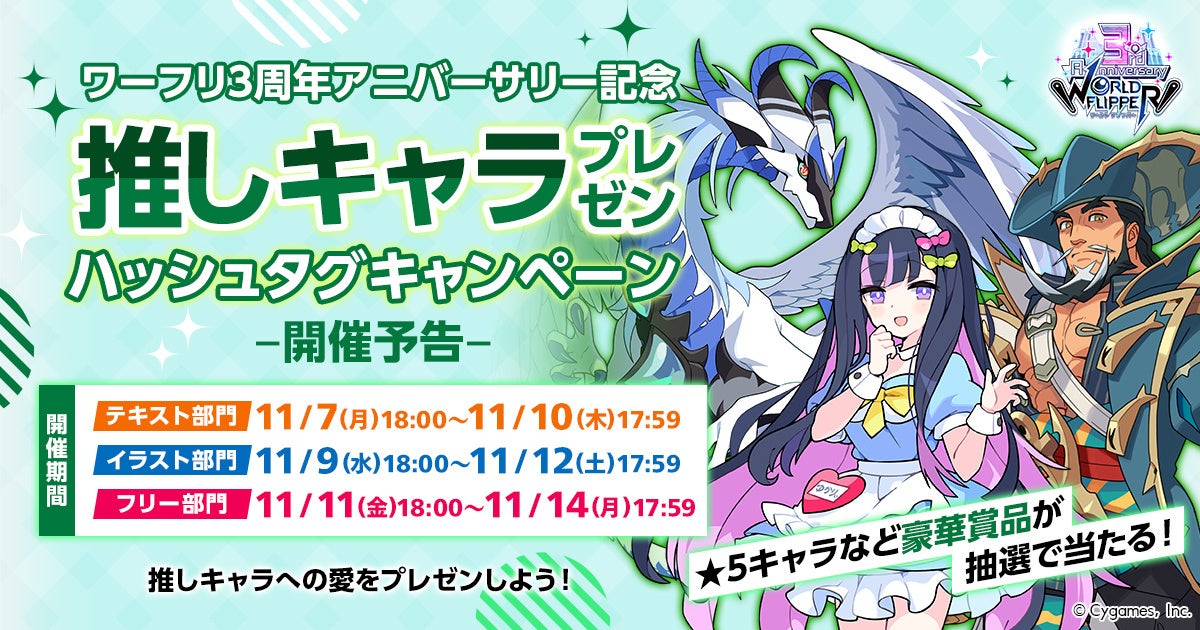 11月7日(月)より、『ワールドフリッパー』に登場する推しキャラをTwitterでプレゼンすることで、お好きな「★5キャラ1体」や星導石3,000個が当たるキャンペーンを実施します。