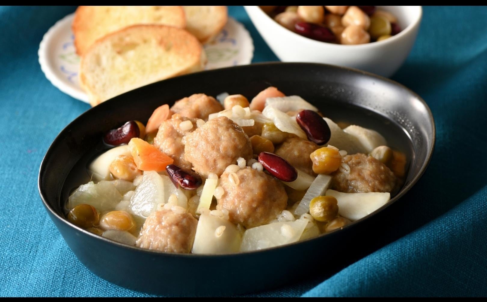ほっこり!冬の定番煮込み料理の『コシード』は、大麦と3色豆を使い、ヘルシーに仕上げました。