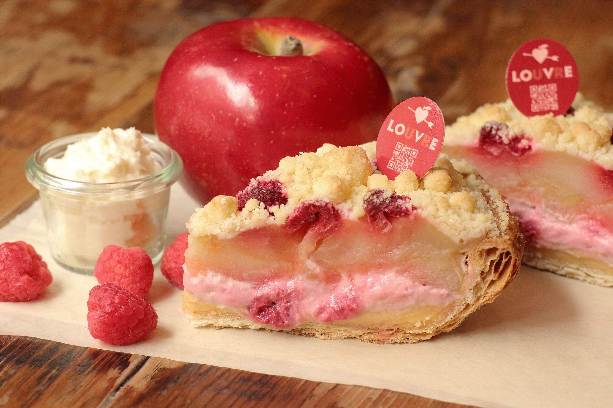 「ルーヴル美術館展 愛を描く」の開催を記念して、グラニースミスの各店舗で限定販売される『ラヴ・ルーヴル アップルパイ』は、展覧会のテーマと同じ”愛”をモチーフにしたアップルパイです。ピンク色の愛らしい断面が印象的で、ショーケースの中でも一際目を惹く華やかなアップルパイが完成しました。自家製カスタードクリームの上に、ラズベリーとクリームチーズを合わせた心躍るピンク色のクリームを重ね、グラニースミスならではのたっぷり盛られた青森県産りんごと、サクサクのクランブル、色鮮やかなラズベリーを乗せて焼き上げています。
