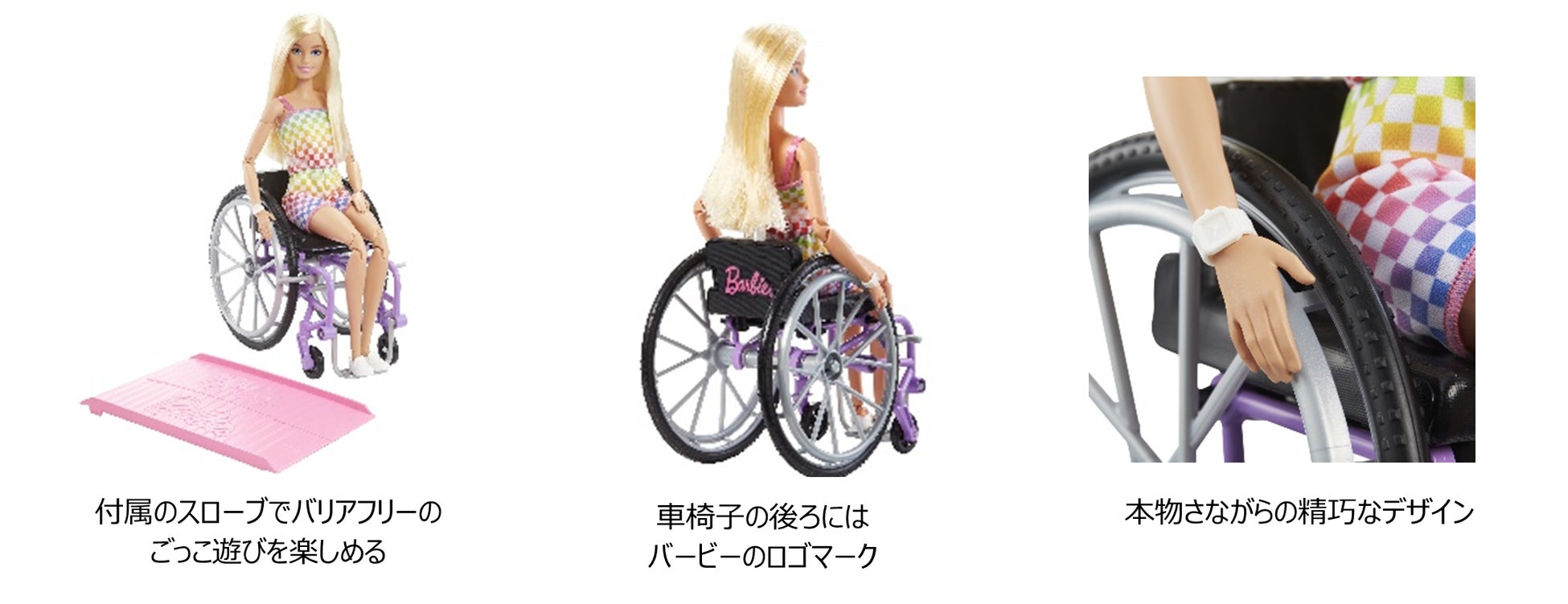 ブロンドのストレートヘアにカラフルなレインボーチェックのロンパース、白い腕時計とスニーカーを身に着けパープルの車椅子に乗ったバービードールです。車いすは専門家の協力のもと、本物の固定式フレームを用いた車いすをモデルにしてデザインされたもので、再現度高く仕上げ、車いす後ろにはバービーのロゴマークが施されています。また、ドールは肘・ひざ・足首など22点の可動式なので、自然に車椅子に座らせたり、実際にタイヤが動く車いすの操作をドールで再現しながら楽しむことができます。さらに、付属のスロープをドールやハウスなどと組み合わせることで、バリアフリーのごっこ遊びも楽しめます。