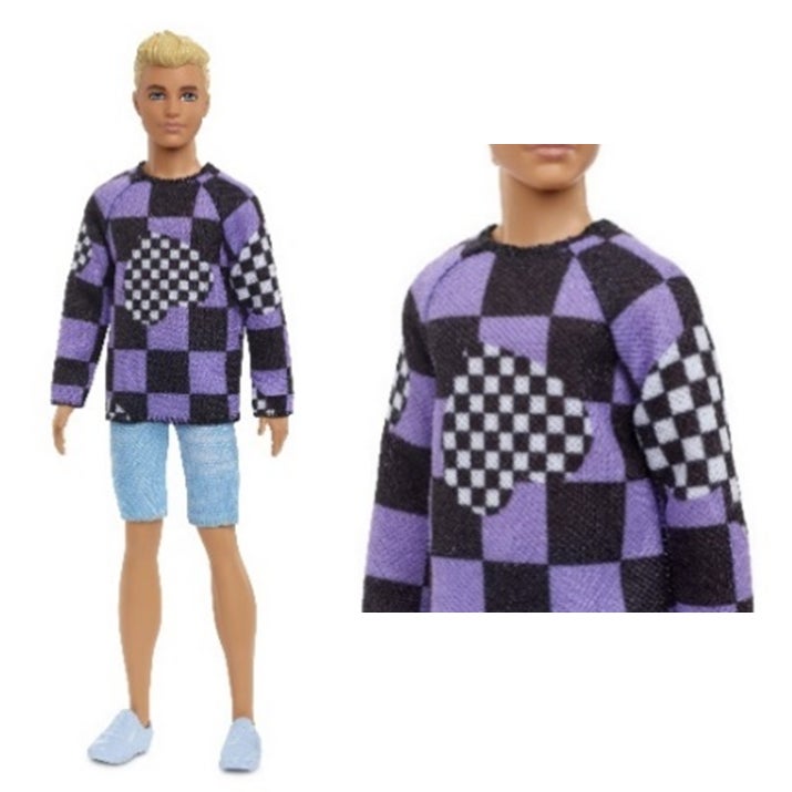 黒と白のチェックのハートをあしらったワンポイントがかわいらしい紫と黒のチェックセーターと、デニムのショートパンツにスニーカーを合わせた、モダンでスポーティーなスタイルのケンのドールです。他のドールを集めて、自分だけの物語を作ることもできます。