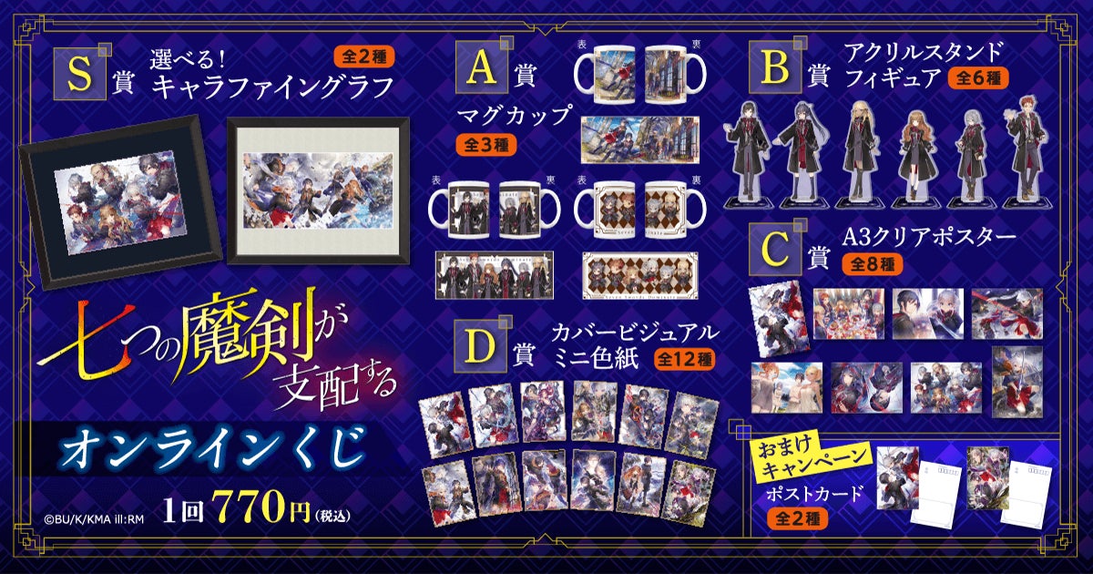 株式会社KADOKAWA(本社:東京都千代田区、取締役 代表執行役社長 CEO:夏野 剛、以下 KADOKAWA)は、運営するオンラインくじサービス「くじ引き堂」において、『七つの魔剣が支配する』オリジナル商品が手に入る<『七つの魔剣が支配する』オンラインくじ>を、2023年8月29日(火)17時より販売
