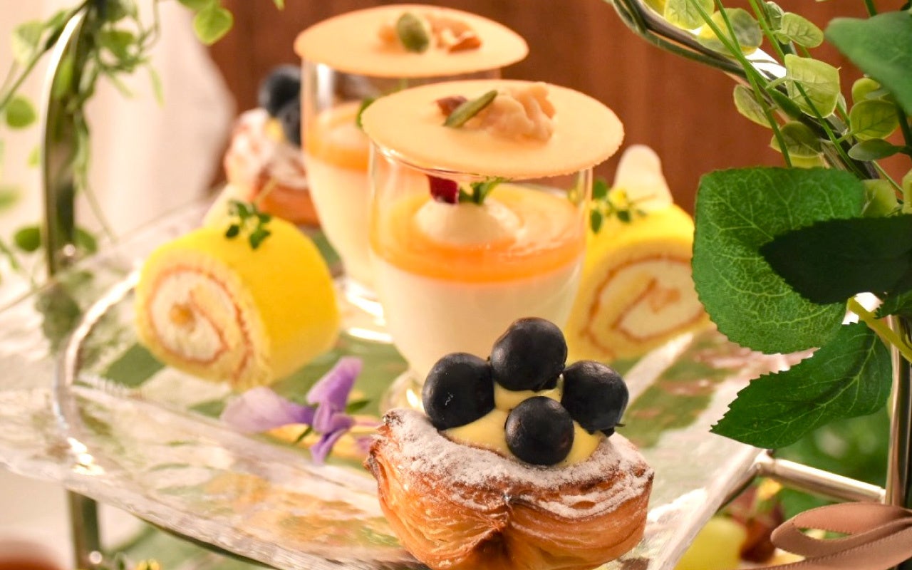 「ティーラウンジ ベルクール」で季節ごとに展開しているアフタヌーンティーセット。 燦々と照りつける太陽がまぶしい真夏の季節に向けて、“ひんやりとした森の中で涼を感じるひととき”をテーマにしたアフタヌーンティーセットをご用意いたしました。メロン・ブルーベリー・桃などの瑞々しい旬のフルーツを使ったスイーツや、栄養価の高いスーパーフード「キヌア」を使ったセイボリーなど、暑さで疲れた身体を癒す爽やかなメニューがラインナップ。涼しい森の中をイメージして草花をあしらったスタンドに、爽やかなスイーツたちが並びます。