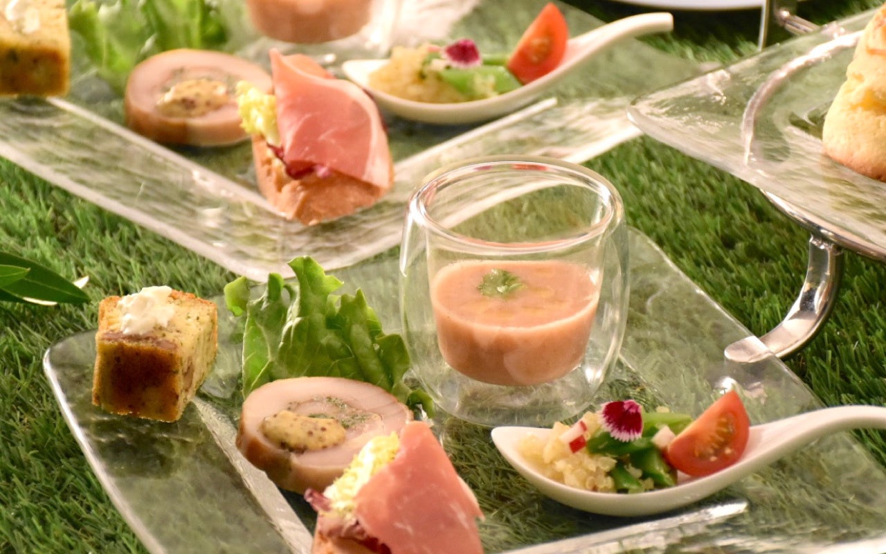 ガスパチョ/豆とキヌアのサラダ/生ハムのオープンサンド/鶏ハーブロール/野菜のケークサレ