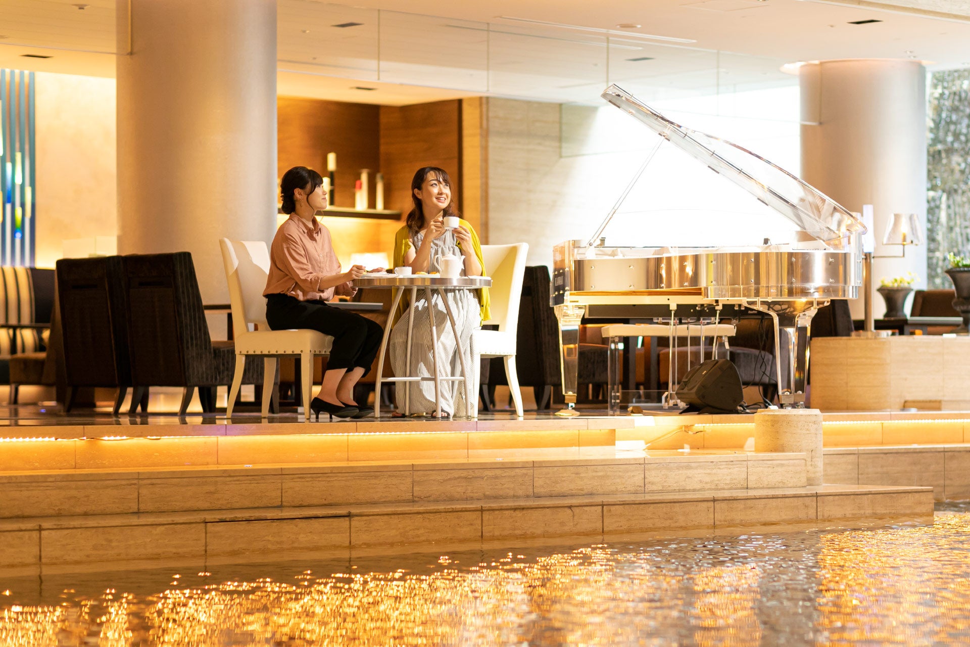 天井高17mのメインロビーに面しているベルクール。店内の横には自然光差し込む滝が流れており、水の音でも涼しさを感じることができます。水辺に映る情景にも癒される店内で、午後の優雅なひとときをお過ごしいただけます。