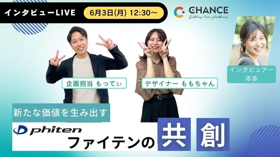 キャンペーン開始の皮切りとして、インタビューライブを配信いたします。初日6/3(月)12:30はライブ配信で共創を進める企業「ファイテン」の事例、6/6(木)20:30は企業コラボで活動を広げるライバー「あおい」へのインタビューライブも配信予定。