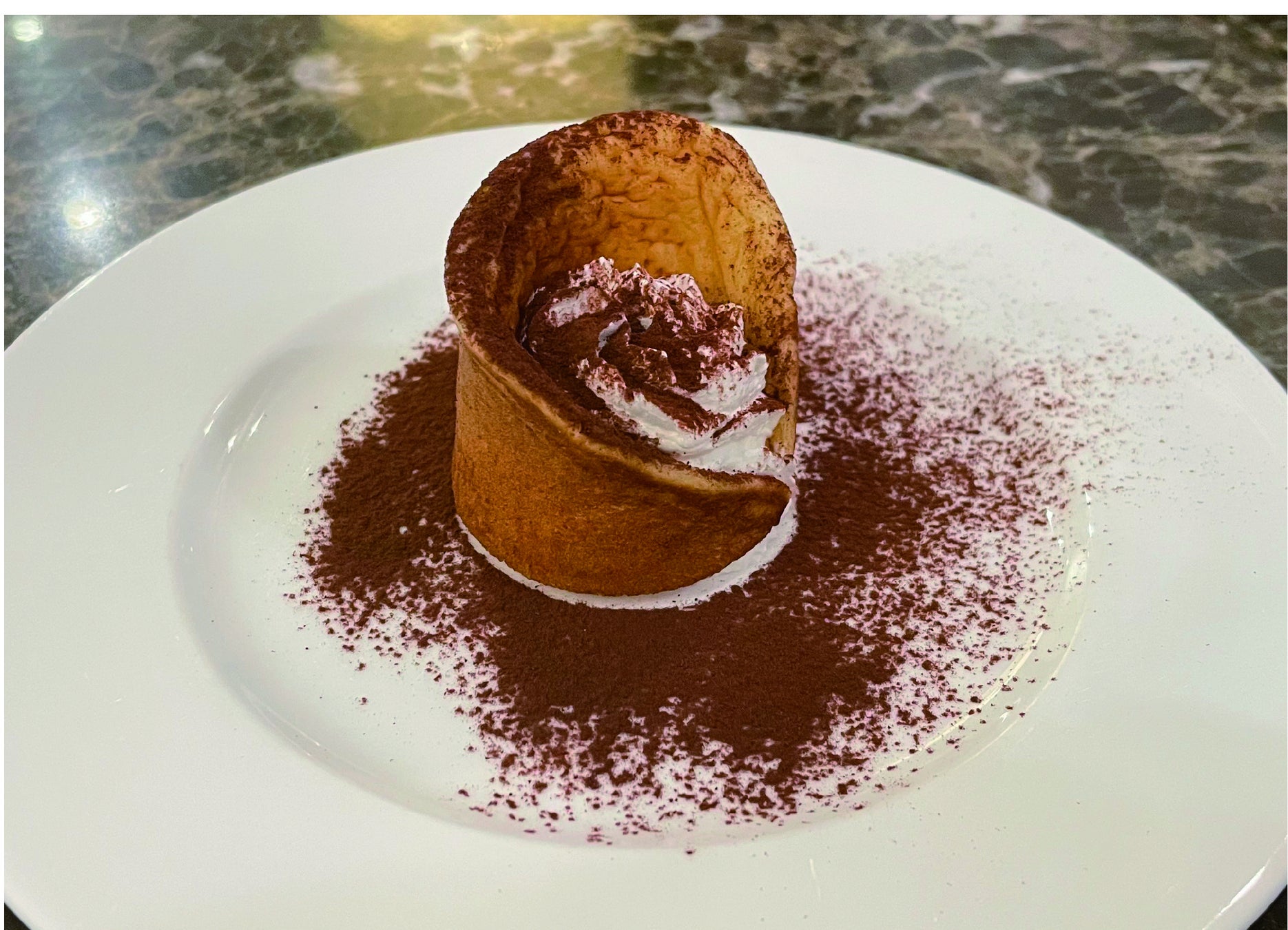 豊橋限定の人気のお土産「ブラックサンダーあん巻き」で有名な「お亀堂」のふんわり、もっちり焼き上げたあん巻きの皮でマスカルポーネクリームを包み、仕上げにココアパウダーをかけたコラボデザートです。皮のもっちりした食感と、なめらかなクリームが絶妙な、一口ティラミスのようなデザート。お客様の目の前で仕上げて提供します。