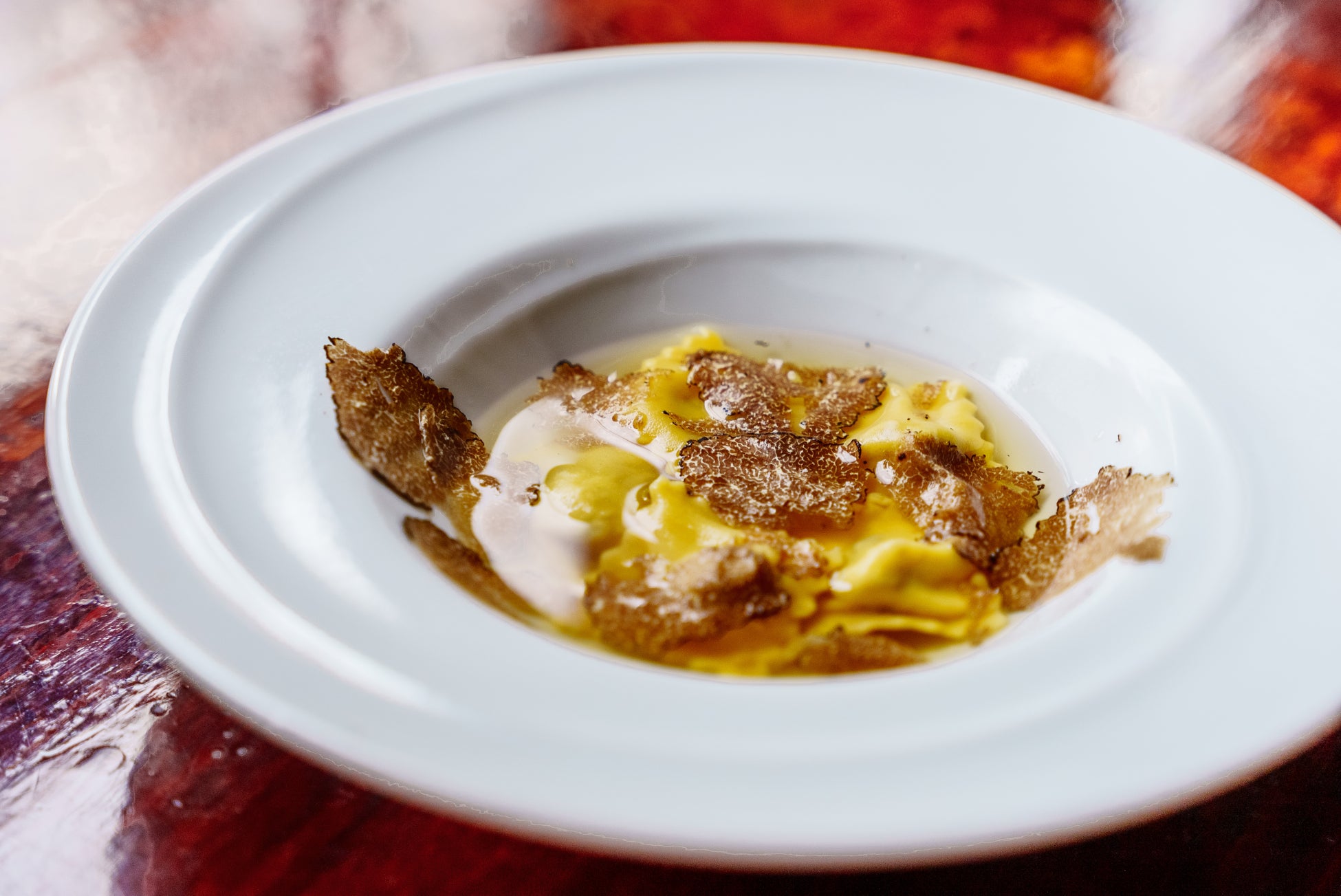 ・福島産川俣軍鶏と岩手産椎茸のラビオリ そのコンソメと黒トリュフ