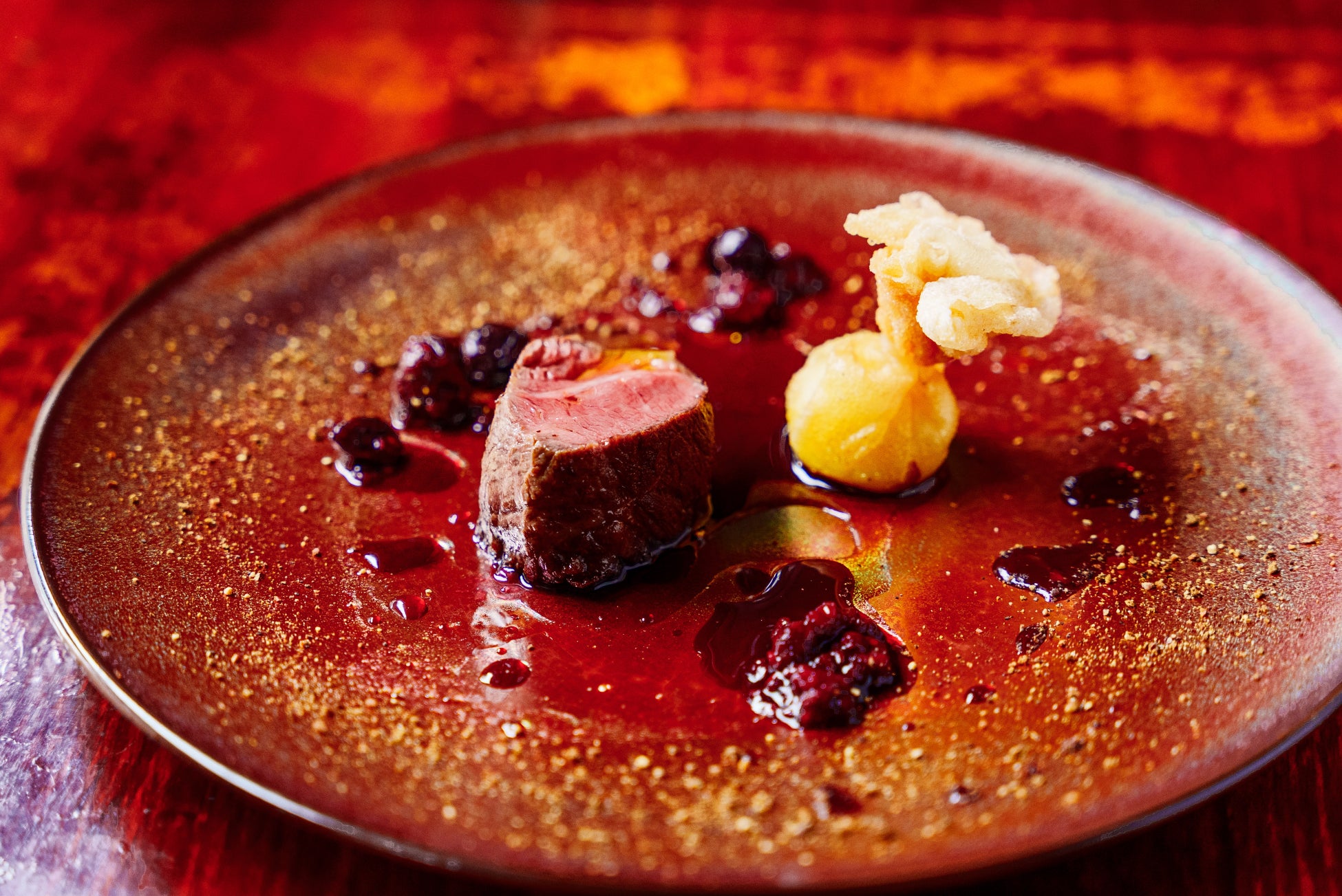 ・A-5 仙台牛の炭火焼き さつまいもとベリーのソース