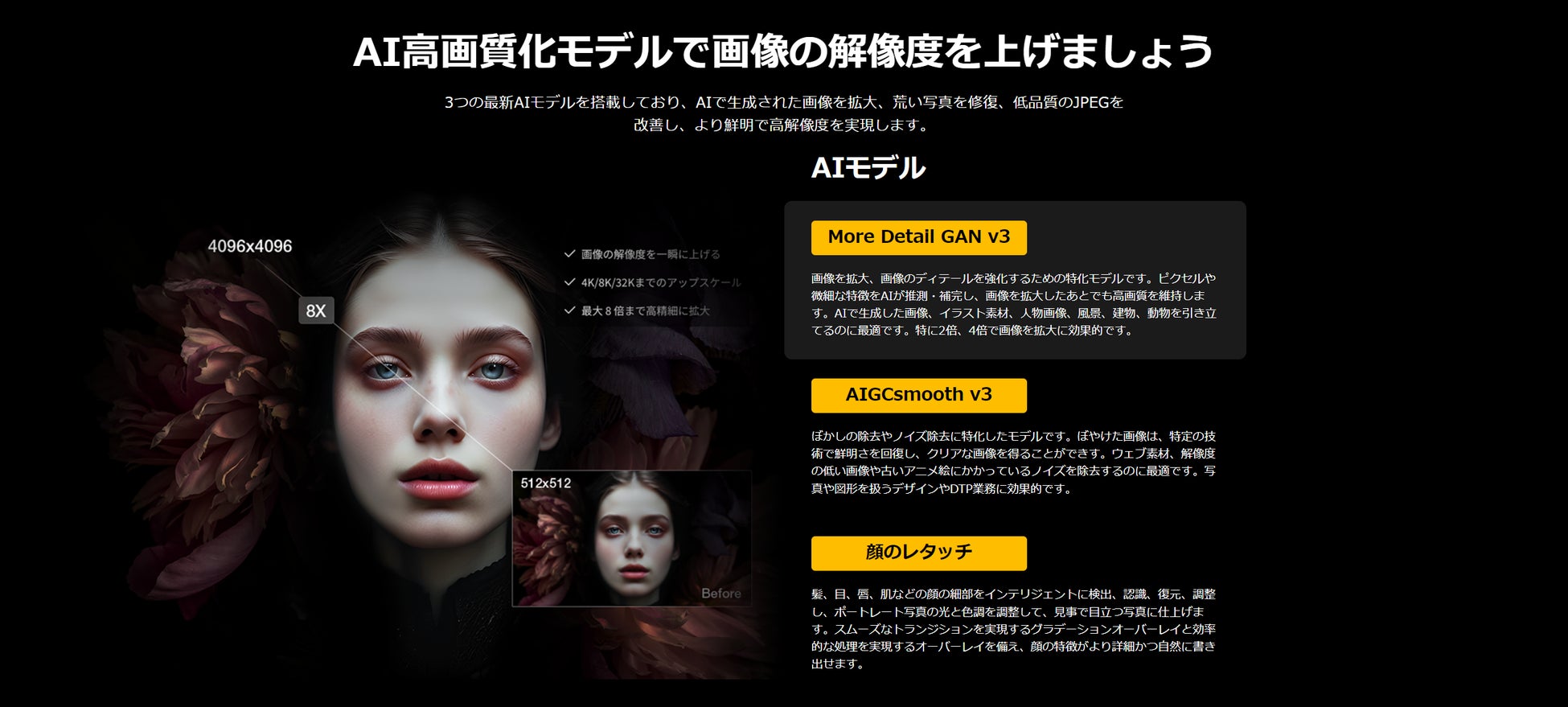 人気のAI高画質化ツールV3.0は、「More-Detail GAN v3」、「顔のレタッチ機能」と「DPI(解像度)の書き出し設定機能」を2024年12月にリリースしました。これらの新機能は、効率化で大幅な性能向上と高画質化を実現することが可能となります。詳細は公式サイト(https://jp.aiarty.com/aiarty-image-enhancer/) でご確認いただけます。
