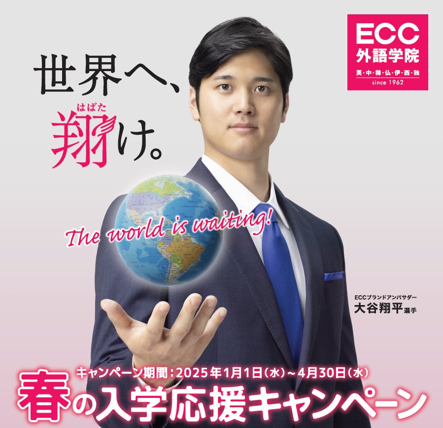 総合教育・生涯学習機関の株式会社ECC(本社:大阪市北区、代表取締役社長:花房雅博)が運営するECC外語学院は、ECCブランドアンバサダーでメジャーリーガーの大谷翔平選手が出演する新TVCM『ECC外語学院「The world is waiting!」篇』(15秒、30秒)を制作。2025年1月6日(月)より近畿・関東エリアで放映を開始いたします。