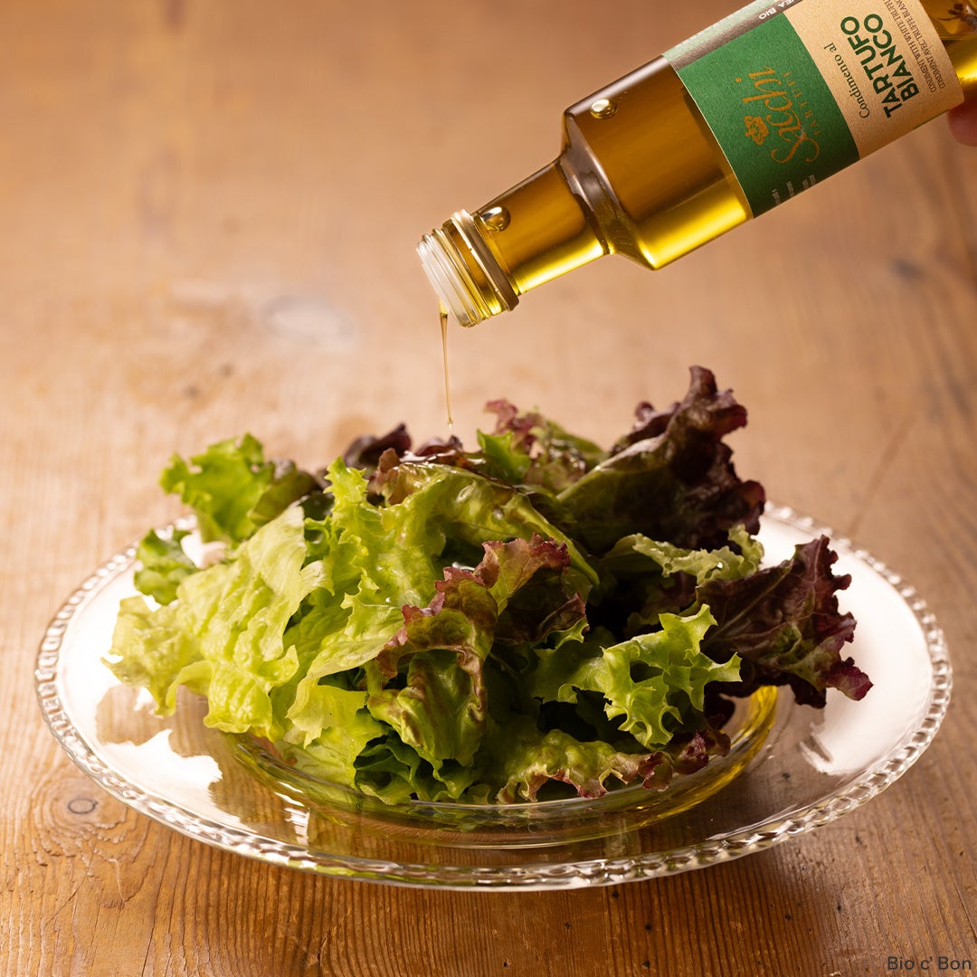 マルケ州アクアラーニャで白トリュフの旬である9月~12月に収穫し、エキストラバージンオリーブオイルに漬け込み香りを移したフレーバーオイルです。グレバと呼ばれる肉質部分の色味は白~明るい黄色で、はっきりとした白色の筋が密集しています。熟成したチーズやバターのような、強く芳しい香りが特徴です。
